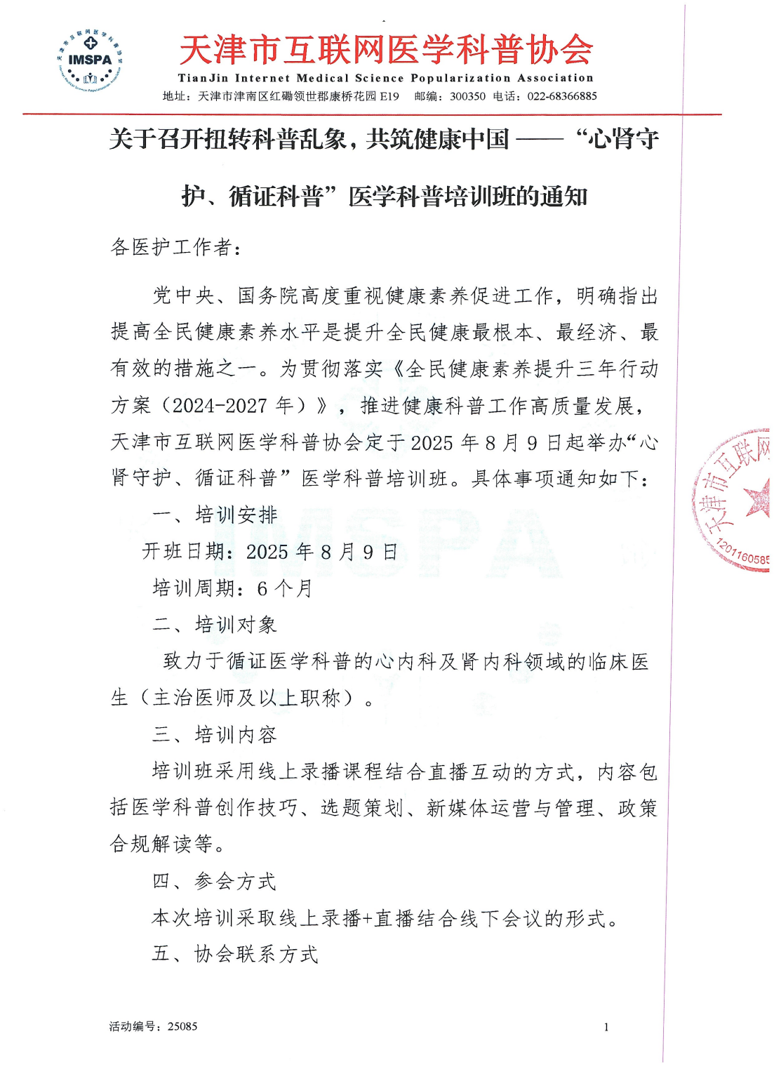 关于召开扭转科普乱象,共筑健康中国- “心肾守护、循证科普”医学科普培训班的通知