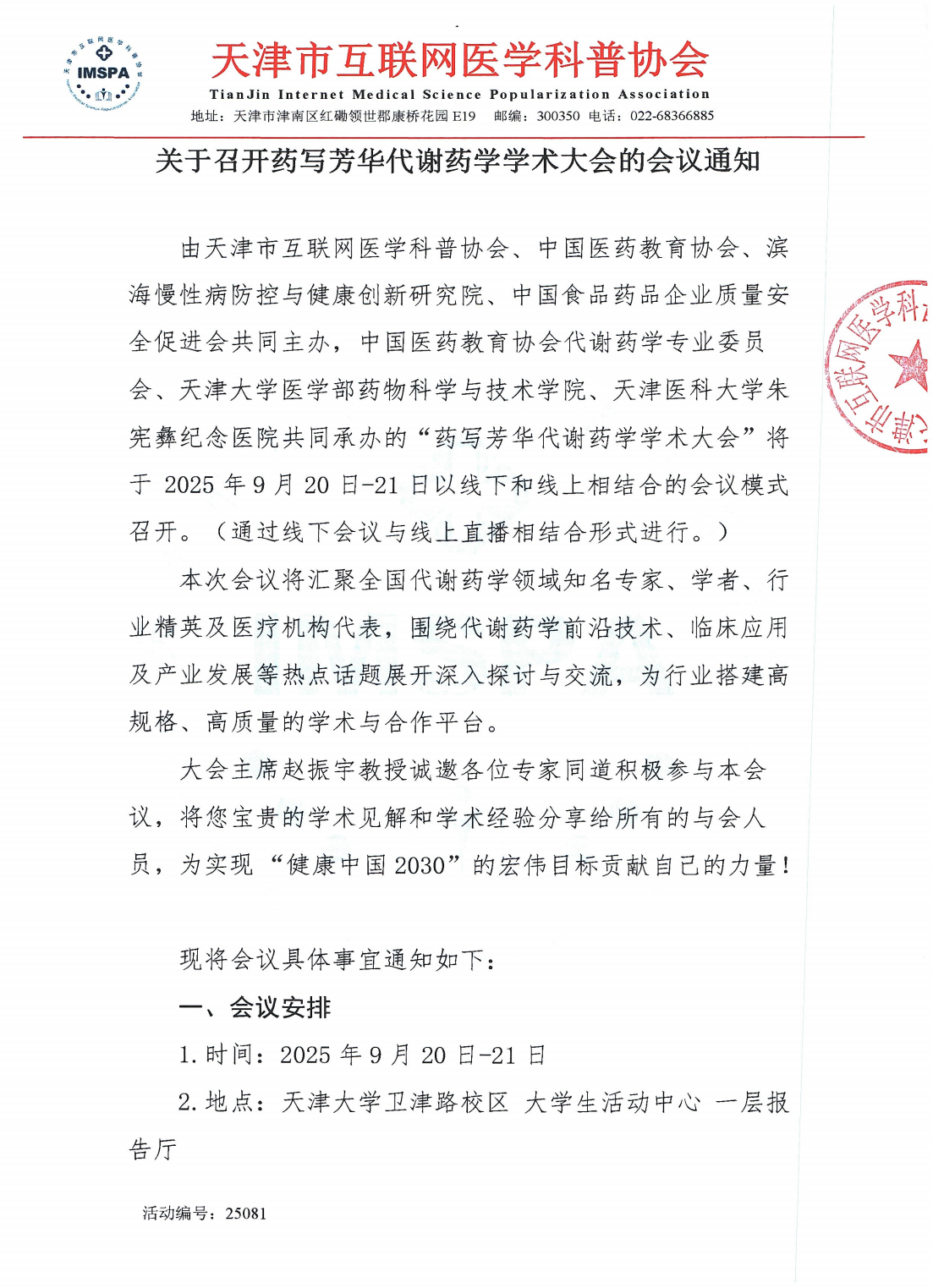 关于召开天津市互联网医学科普协会天津市医学会皮肤性病学分会2025高峰论坛的会议通知