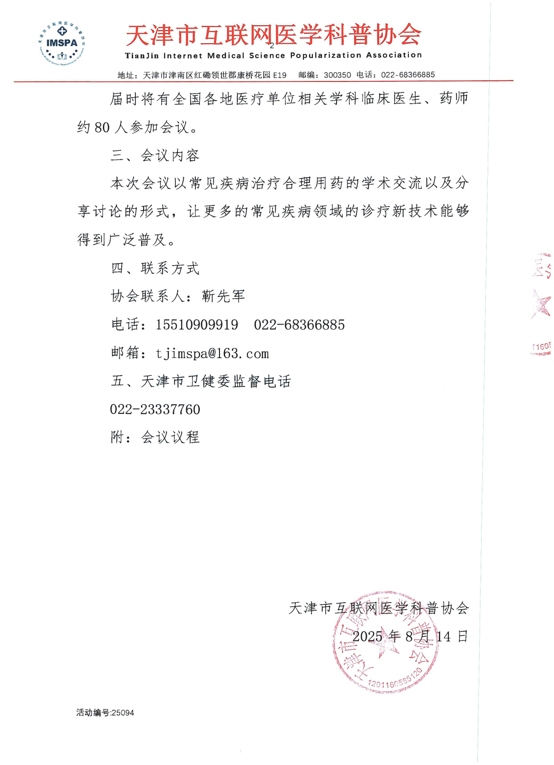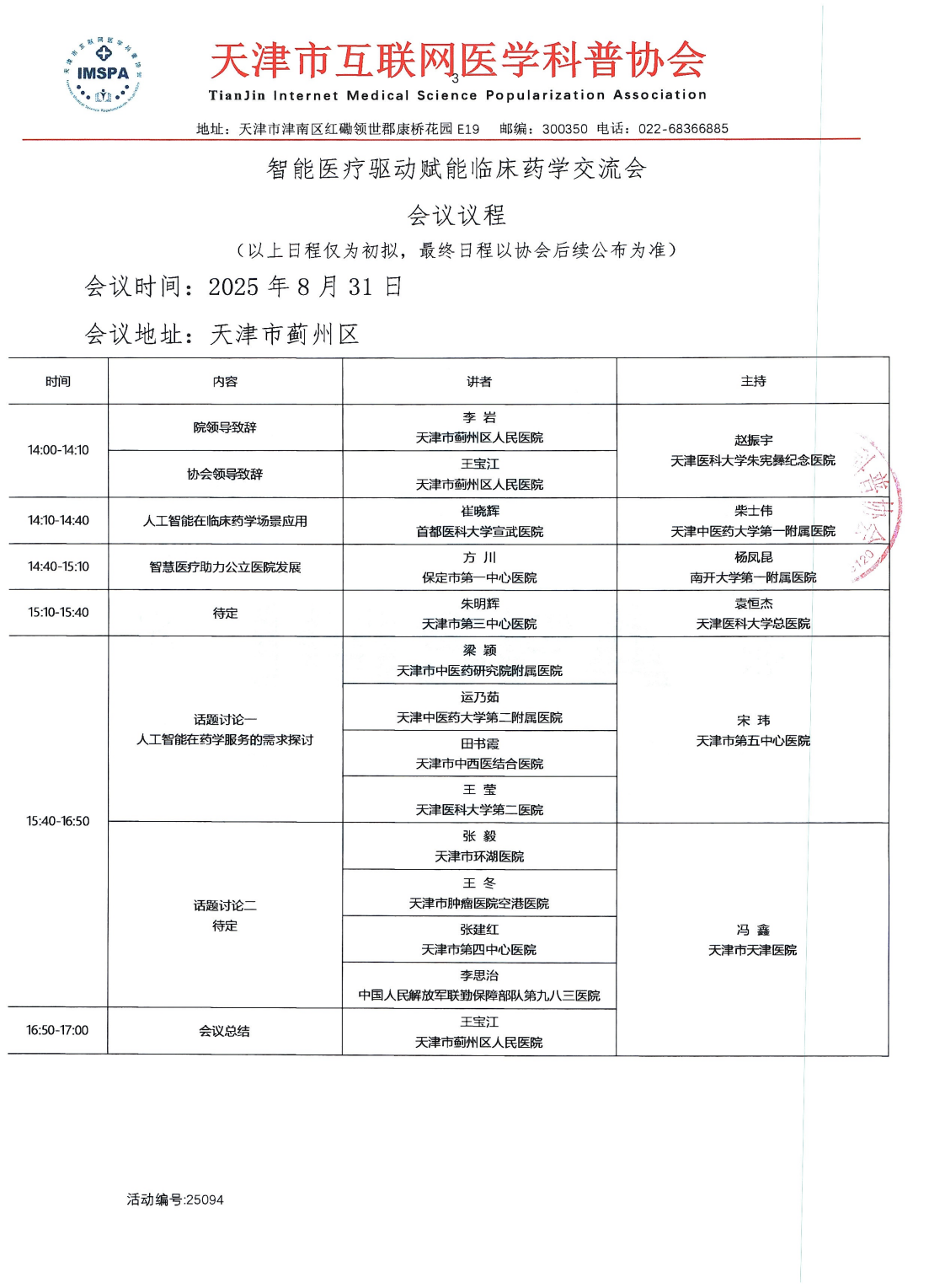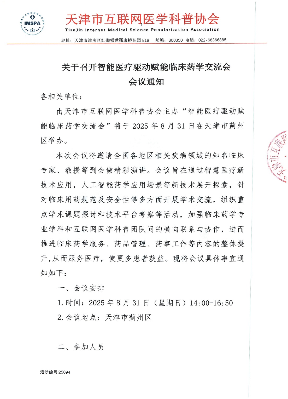 天津市互联网医学科普协会智能医疗驱动赋能临床药学交流会会议通知
