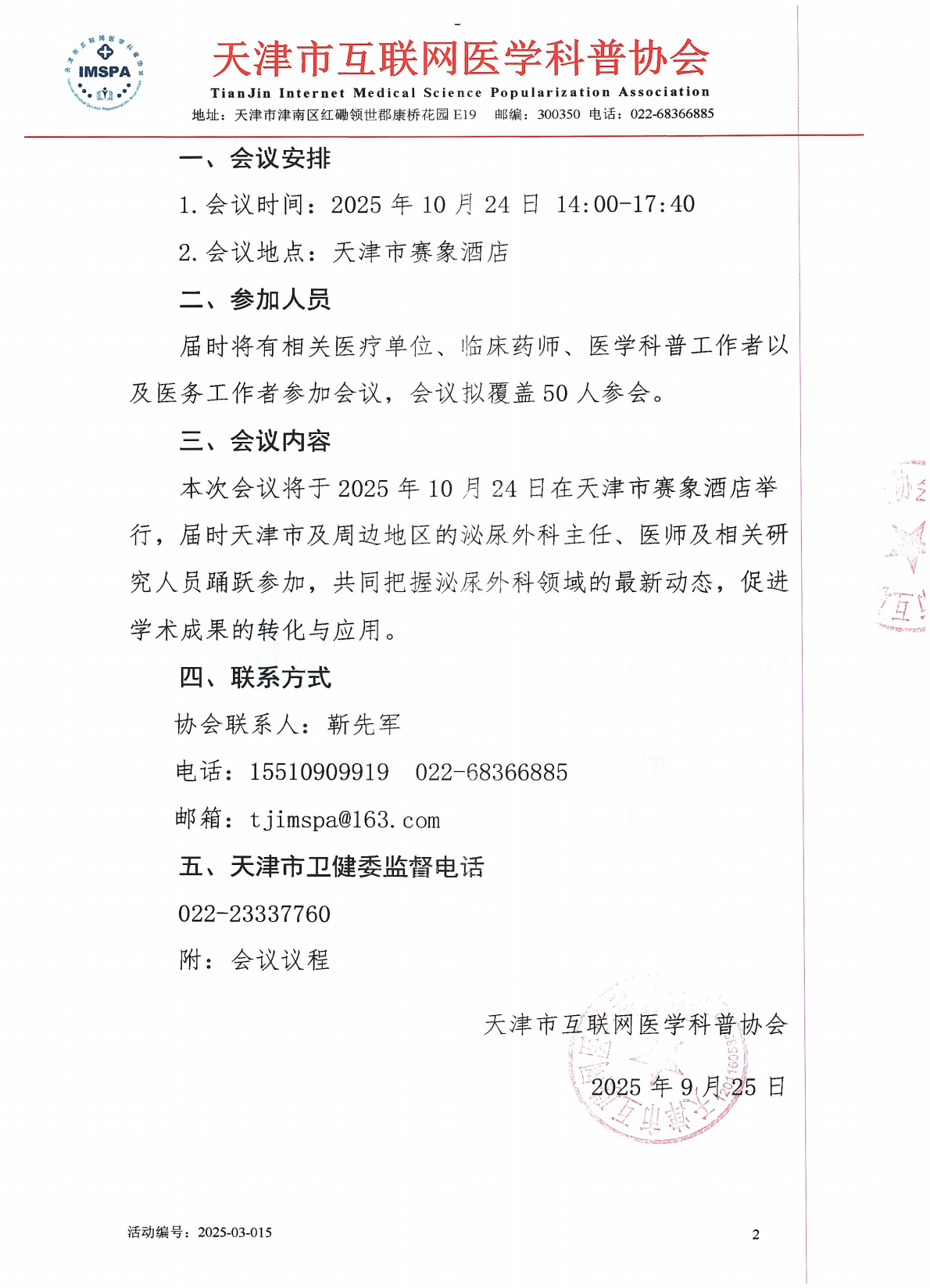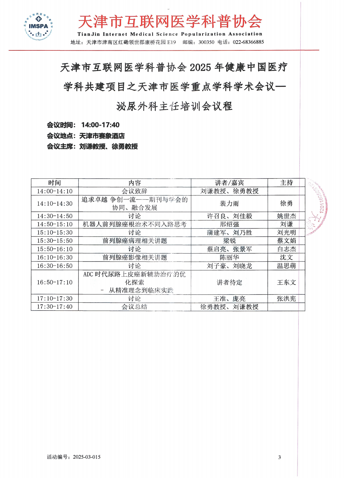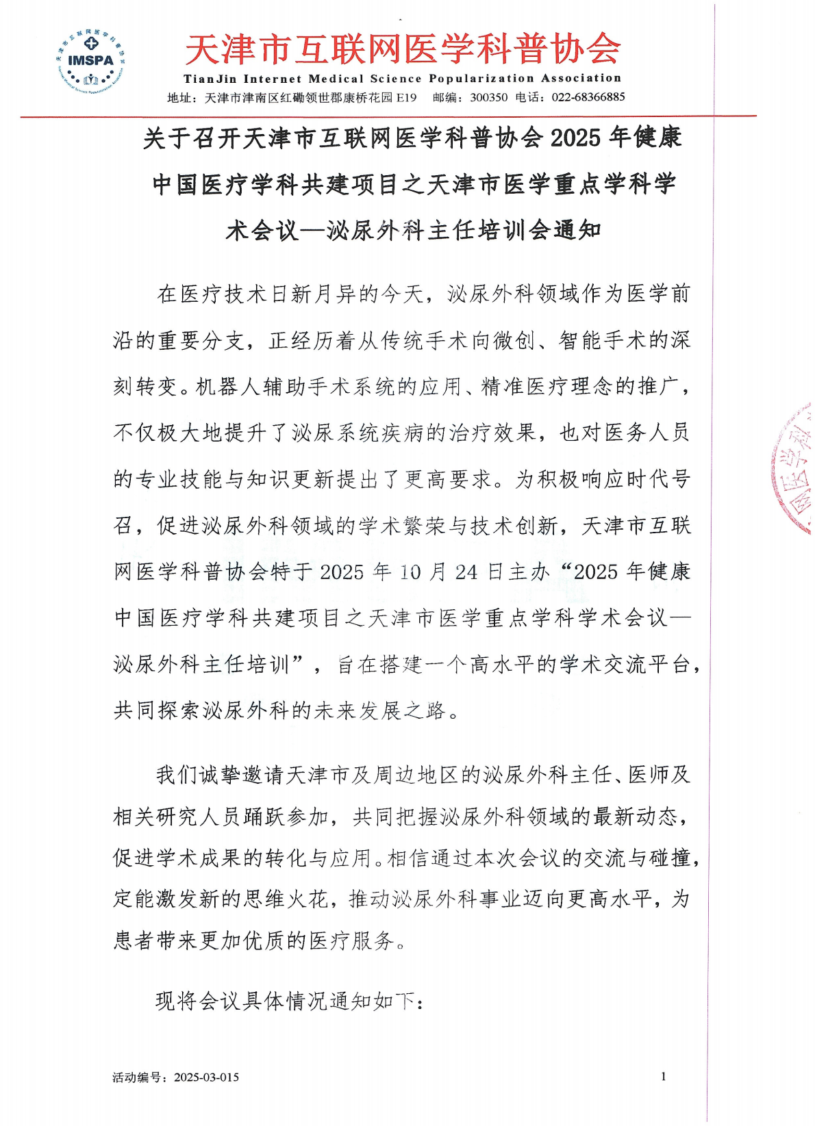 关于召开天津市互联网医学科普协会2025年健康中国医疗学科共建项目之天津市医学重点学科学术会议-泌尿外科主任培训会合作函