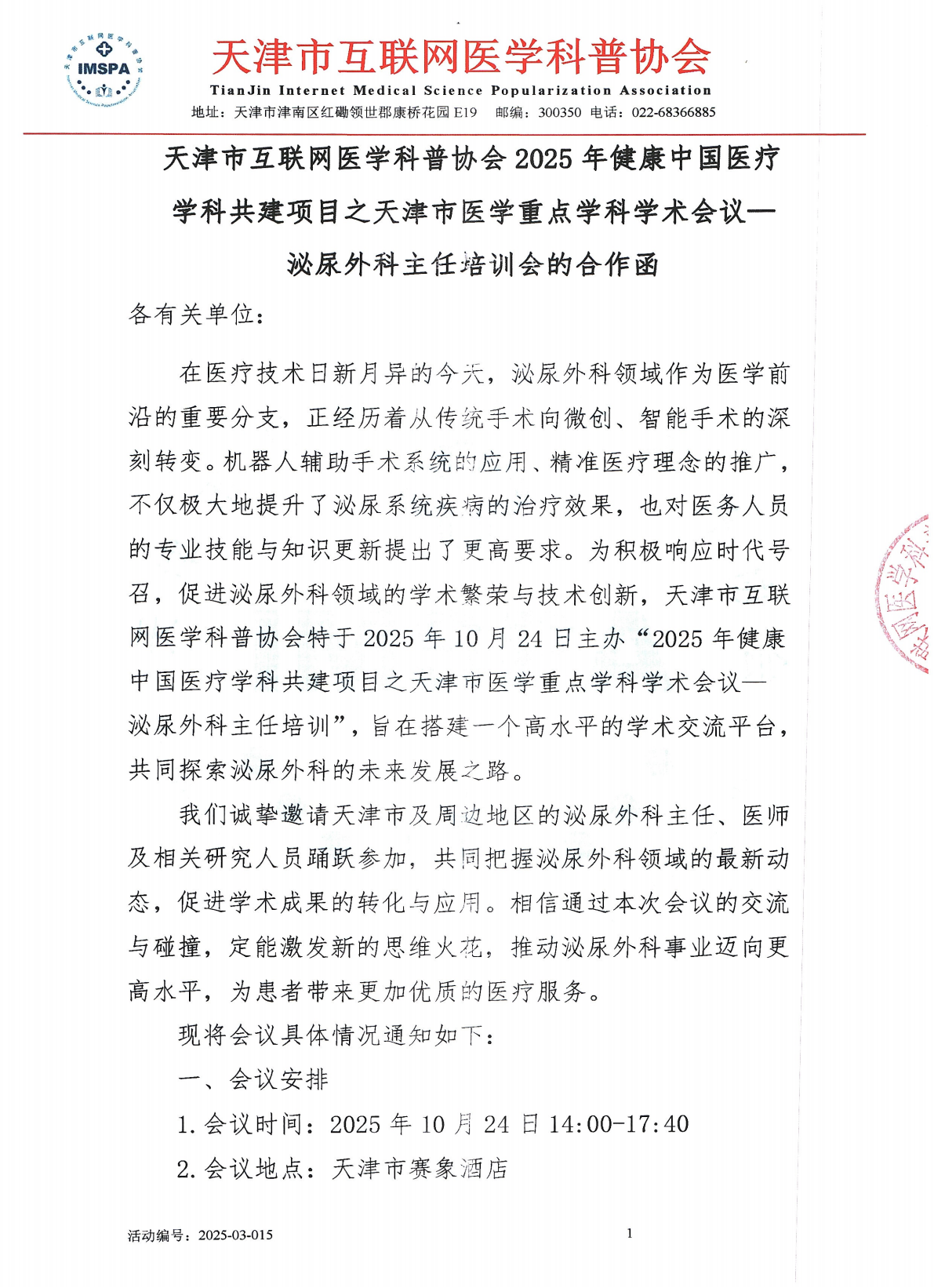关于召开天津市互联网医学科普协会2025年健康中国医疗学科共建项目之天津市医学重点学科学术会议-泌尿外科主任培训会合作函