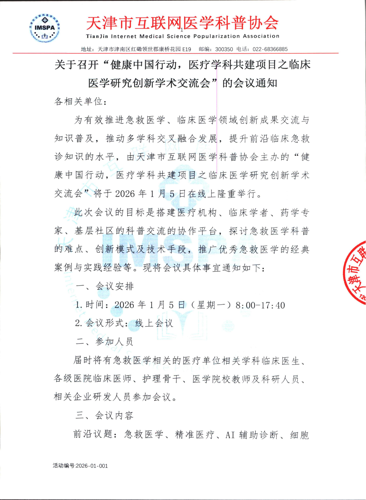 关于召开健康中国行动,医疗学科共建项目之临床医学研究创新学术会议的会议通知