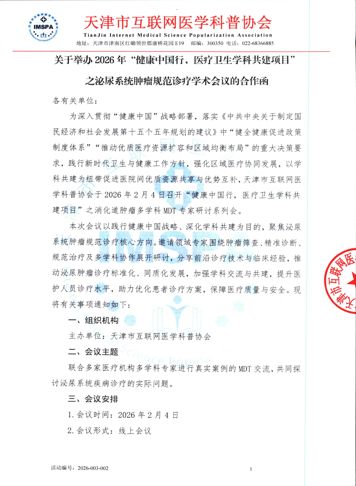关于举办2026年“健康中国行,医疗卫生学科共建项目”之泌尿系统肿瘤规范诊疗学术会议的合作函