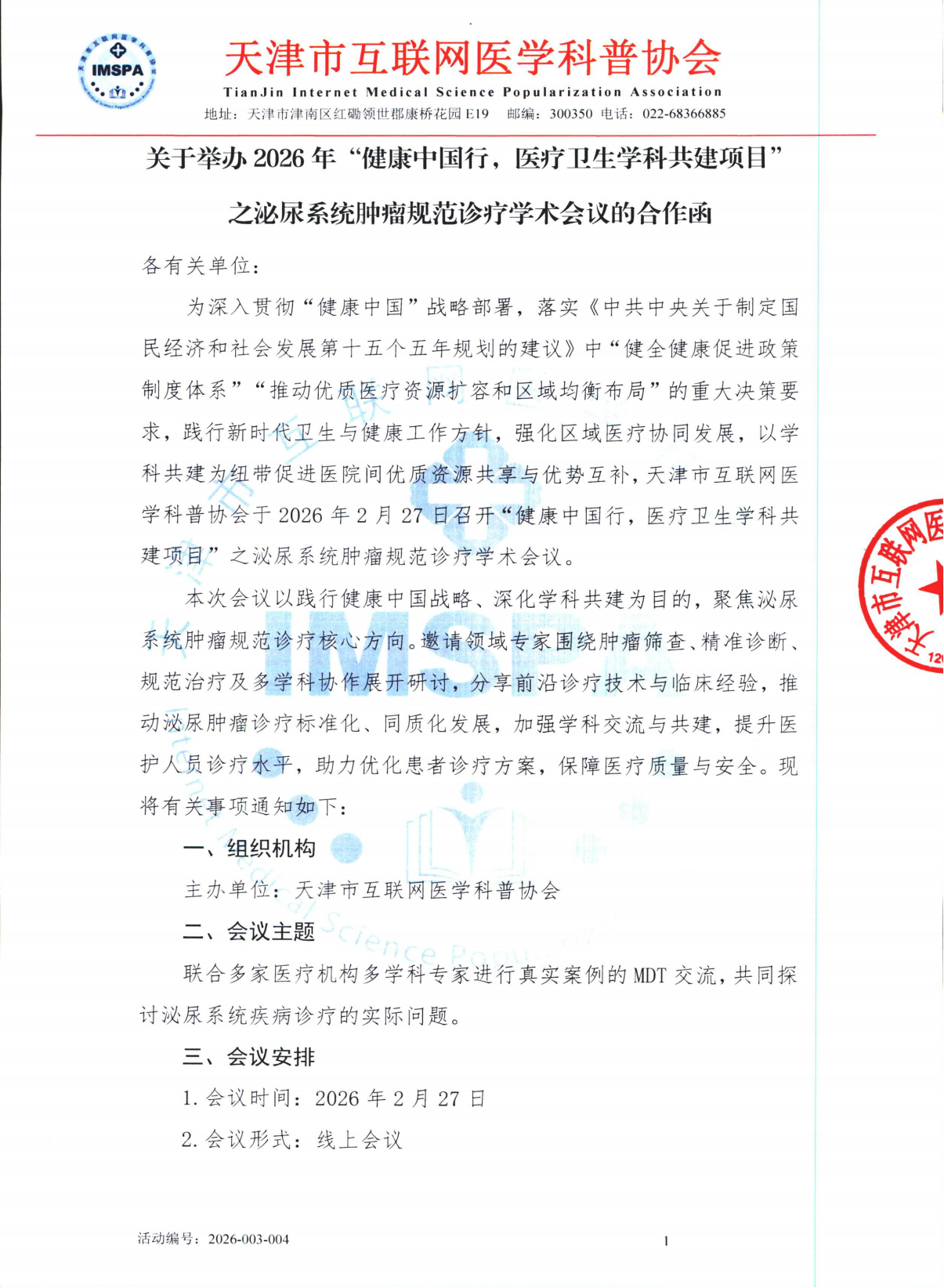 2026-003-005关于举办2026年“健康中国行,医疗卫生学科共建项目”之前列腺肿瘤规范诊疗学术会议合作函