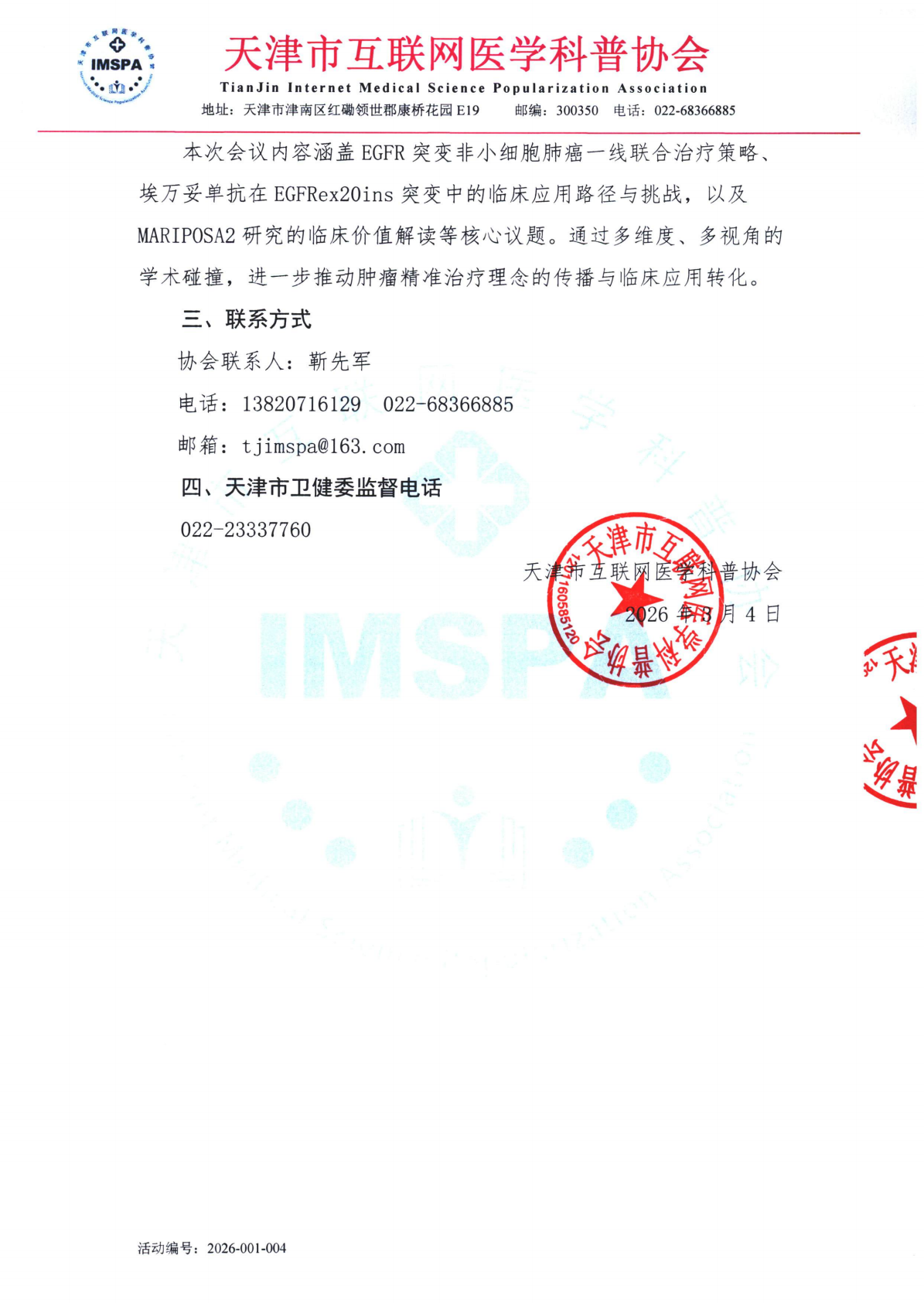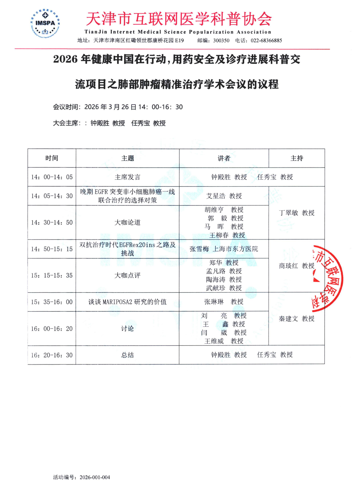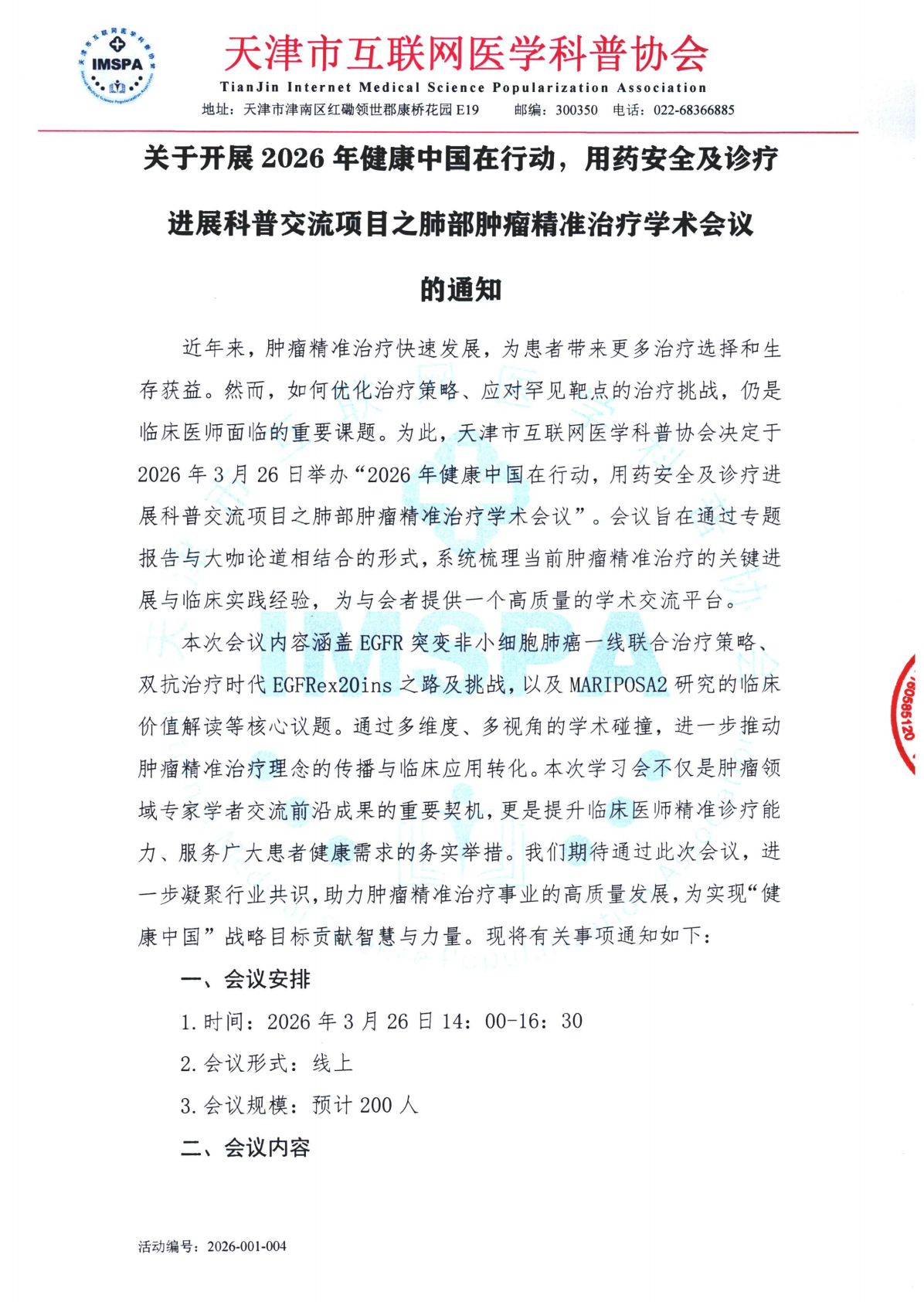 关于开展2026年健康中国在行动,用药安全及诊疗进展科普交流项目之肺部肿瘤精准治疗学术会议的会议通知
